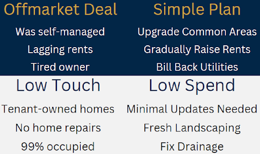 Bring Rents to Market Rent: Upon acquiring the property, we plan to introduce a $100 monthly increase in lot rent with tenants receiving a 60-day notice from the outset. A $50 rent increase will take place in Year 2, and a $35 increase in year 3, bringing the average rent rate to$485 per pad.